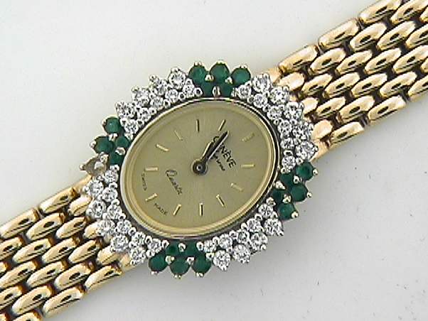 14K YELLOW GOLD WATCH WITH 1.40CT ROUND SHAPE DIAMOND & 1.00CT ROUND SHAPE EMERALD.