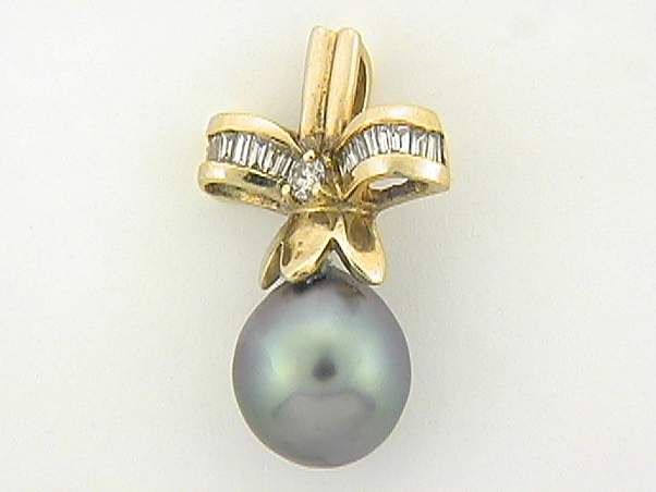 18K YELLOW GOLD PENDANT WITH .40CT BAGUETTE DIAMOND ,.10CT ROUND SHAPE DIAMOND AND ,11MM, BLACK PEARL.