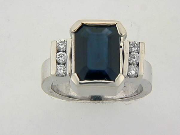 14K WHITE GOLD LADIES RING WITH .35CT ROUND SHAPE DIAMOND SET IN CHANNEL SETTING. WITH 4.16CT EMERALD CUT SAPPHIRE.