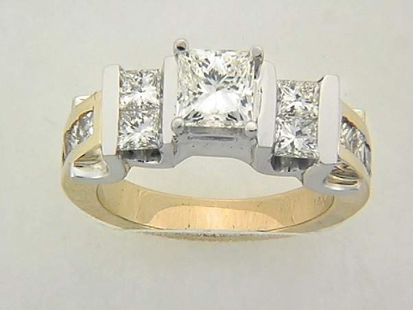 14K HAND MADE DESIGN RING WHITE AND YELLOW GOLD WITH 1.05CT CHANNEL SETTING , CENTER OF 1.01CT VS1, H,I PRINCESS CUT DIAMOND.