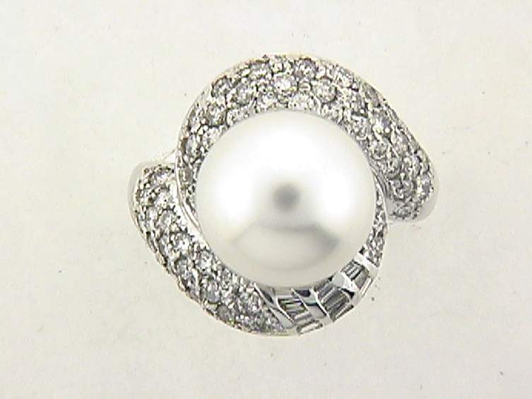 14K WHITE GOLD RING WITH 1.20CT ROUND DIAMOND SET IN PAVE’ SETTING, .35CT BAGUETTE DIAMOND SET IN CHANNEL SETTING. CENTER OF 12MM PEARL.