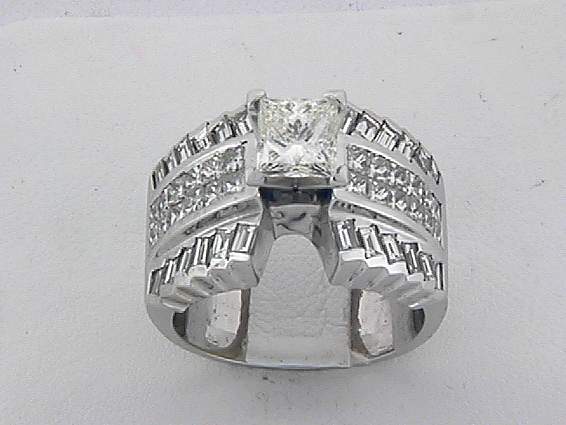 18K WHITE GOLD RING WITH 1.20CT BAGUETTE DIAMOND SET IN CHANNEL SETTING, 1.30CT PRINCESS CUT DIAMOND SET IN INVISIBLE SETTING.