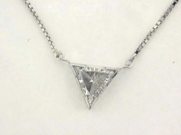 14K WHITE GOLD NECKLACE WITH .74CT TRIANGLE DIAMOND SET IN BEZEL SETTING.
