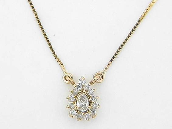 14k yellow gold necklace with .30ct round shape diamond, .24ct pear shape diamond set in pronges setting.