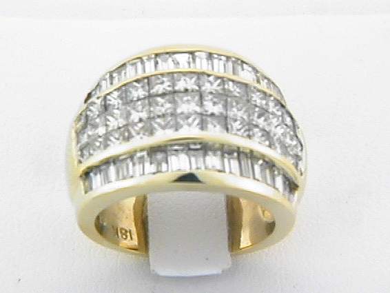18K YELLOW GOLD RING WITH 3.15CT PRINCESS CUT, 2CT BAGUETTE DIAMOND SET IN INVISIBLE AND CHANNEL SETTING.