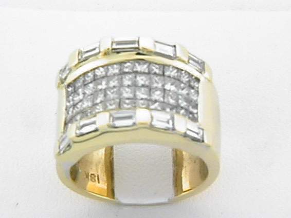 18K YELLOW GOLD RING WITH 2CT PRINCESS CUT, 1.10CT BAGUETTE DIAMOND SET IN CHANNEL AND INVISIBLE SETTING.