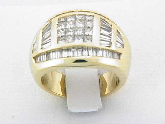 18K YELLOW GOLD RING WITH 1CT PRINCESS CUT, 1.90CT BAGUETTE DIAMOND SET IN CHANNEL AND INVISIBLE SETTING.