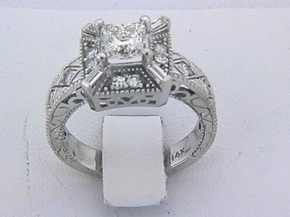 14K WHITE GOLD RING WITH CENTER OF 1.12CT PRINCESS CUT DIAMOND AND .35CT BAGUETTE, .15CT ROUND SHAPE DIAMOND SET IN PAVE’ AND PRONGS SETTING.