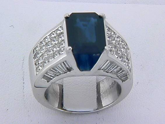 18K WHITE GOLD RING WITH 2CT PRINCESS CUT DIAMOND SET IN INVISIBLE SETTING , 1.10CT BAGUETTE DIAMOND SET IN CHANNEL SETTING. CENTER OF EMERALD CUT SAPPHIRE SET IN FOUR PRONGS SETTING.