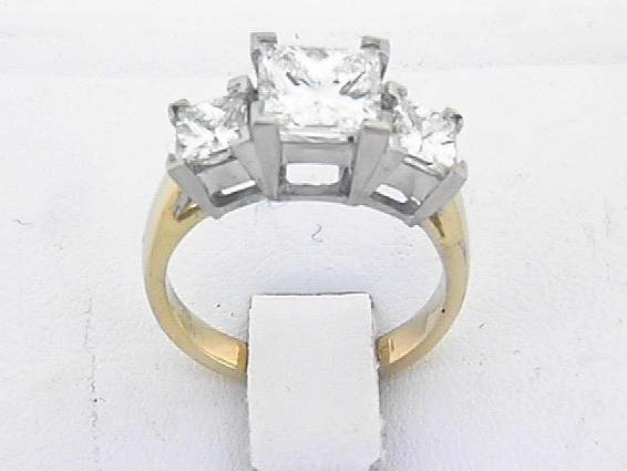 14K TWO TONE RING WITH SIDE OF 2PC, PRINCESS CUT DIAMOND 1.10CT , CENTER OF 2.03CT VS2 I PRINCESS CUT MEAS: 7.23X6.85X5.05MM . E G L REPORT #US72531631D.SET ALL IN FOUR PRONGS SETTING.