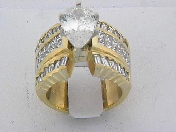 18K YELLOW GOLD LADIES RING WITH 1.20CT BAGUETTE, 1.30CT PRINCESS CUT DIAMOND SET IN INVISIBLE AND CHANNEL SETTING. CENTER OF 2.24CT PEAR SHAPE DIAMOND SET IN PRONGS SETTING.