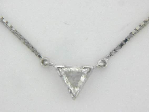 14K WHITE GOLD NECKLACE WITH .40CT TRIANGLE DIAMOND SET IN BEZEL SETTING.