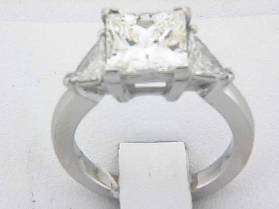 PLATINUM RING WITH 2PC, TRIANGLE DIAMOND .70CT SET IN PRONGS SETTING, CENTER OF 3.46CT VS,J, SET IN FOUR PRONGS SETTING. TOTAL OF 4.16CT DIAMOND.