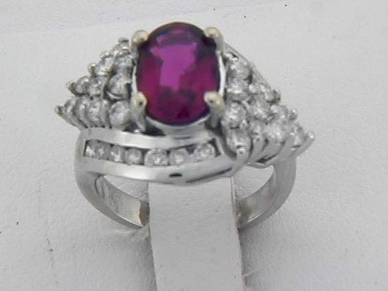 14K WHITE GOLD RING WITH 1.30CT ROUND SHAPE DIAMOND , AND 2.26CT RUBYLITE SET IN PRONGS AND CHANNEL SETTING.