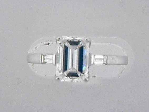 14K WHITE GOLD RING WITH .21CT BAGUETTE DIAMOND, CENTER OF 2.11CT VVS1,I EMERALD CUT DIAMOND, MES: 9.08X6.33X4.07 MM. HRD, CERT#20024354701 . SET IN PRONGES SETTING.