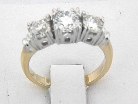 14K WHITE AND YELLOW GOLD RING WITH 2PC, 1CT ROUND SHAPE DIAMOND, AND CENTER OF .70CT ROUND SHAPE DIAMOND SET IN FOUR PRONGS SETTING.