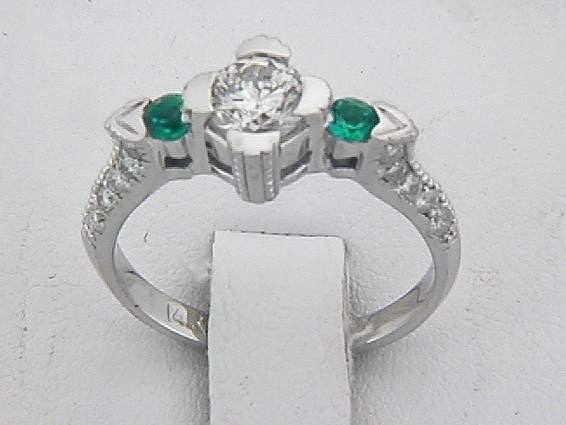 14K WHITE GOLD RING WITH .20CT ROUND SHAPE EMERALD ,WITH .50CT ROUND SHAPE SET IN PAVE’ SETTING. CENTER OF .73CT ROUND SHAPE SET IN PRONGES.