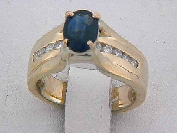14K YELLOW GOLD RING WITH .50CT ROUND SHAPE DIAMOND SET IN CHANNEL SETTING, CENTER OF 1CT OVAL SHAPE SAPPHIRE SET IN FOUR PRONGS SETTING.