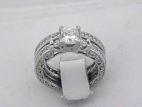 14K WHITE GOLD ENGAGEMENT SET WITH 1.60CT ROUND SHAPE DIAMOND SET IN PAVE’ AND PRONGS SETTING. CENTER OF 1.02CT VS2, G, RECT MOD BRILLIANT DIAMOND MEAS:5.62X4.99X4.16MM