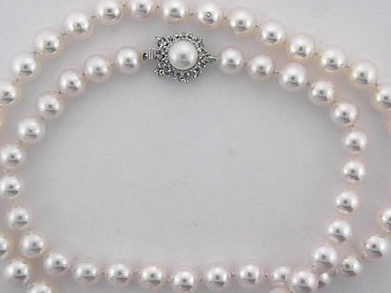 20 INCHES NECKLACE 7.50 MM CULTURD PEARL LIGHT PINK, WITH 14K WHITE GOLD LOCK ,.25CT ROUND SHAPE DIAMOND SET IN PRONGES SETTING.