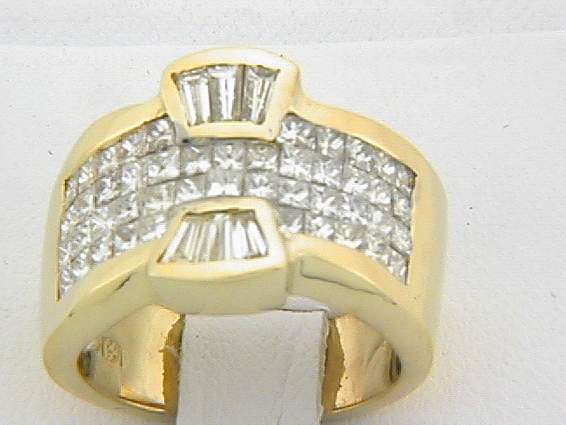 18K YELLOW GOLD BAND WITH 2CT PRINCESS CUT DIAMOND , AND .50CT BAGUETTE DIAMOND SET IN CHANNEL AND INVISIBLE SETTING.
