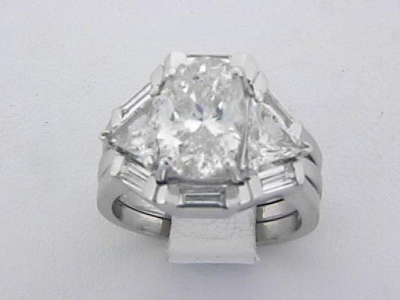 PLATINUM HAND MADE RING WITH .75CT BAGUETTE DIAMOND, .88CT SI,I TRIANGLE DIAMOND SET IN CHANNEL SETTING. AND CENTER OF 3.55CT SI3,I OVAL SHAPE DIAMOND E.G.L #73497804.