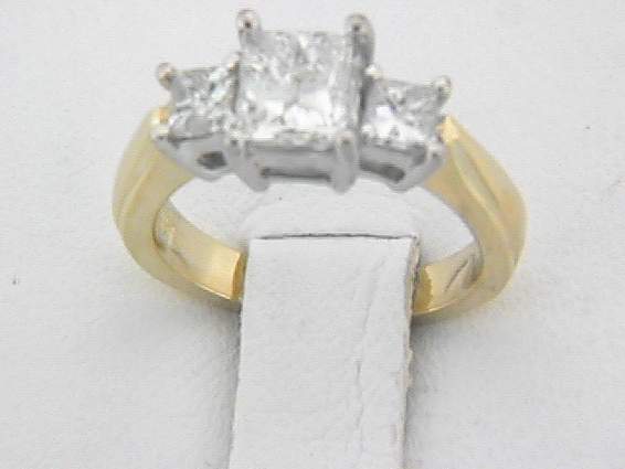 14K WHITE AND YELLOW GOLD RING WITH 2PC, PRINCESS CUT DIAMOND .50CT , CENTER OF .70CT SI,G,H PRINCESS CUT DIAMOND SET IN PRONGES SETTING. TOTAL OF 1.20CT DIAMOND.