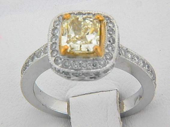14K WHITE GOLD HAND MADE RING WITH .70CT ROUND SHAPE DIAMOND SET IN PAVE’ SETTING , CENTER OF 1.51CT FANCY YELLOW RADIANT CUT DIAMOND SET IN BEZEL PRONGS SETTING.