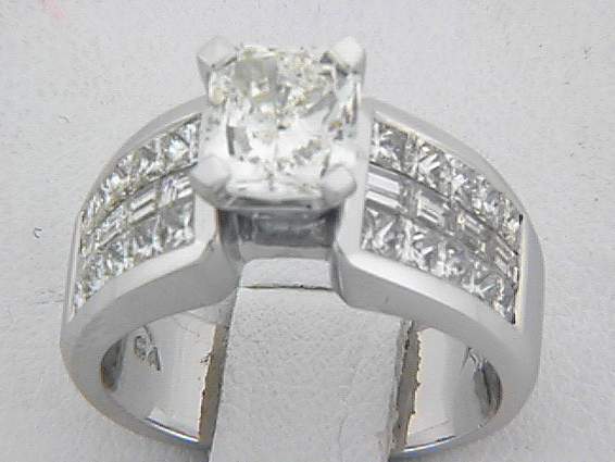 18K WHITE GOLD RING WITH1.30CT PRINCESS CUT DIAMOND, .70CT BAGUETTE DIAMOND SET IN INVISIBLE SETTING. CENTER OF PRINCESS CUT DIAMOND .