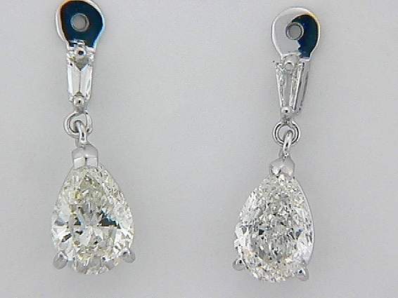 14K WHITE GOLD JACKET EARRING WITH .20CT BAGUETTE DIAMOND, AND 2.50CT PEAR SHAPE DIAMOND SET IN PRONGS SETTING.