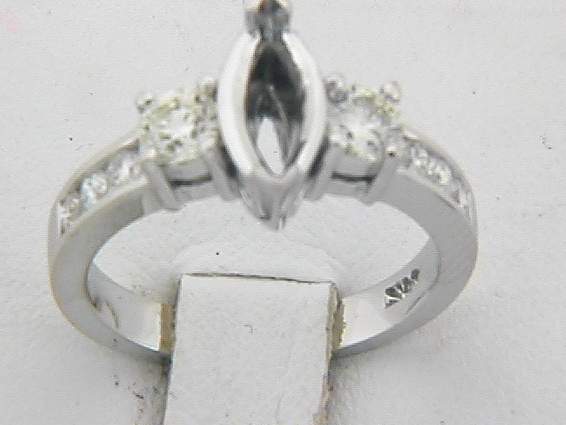14K WHITE GOLD RING WITH .95CT ROUND SHAPE DIAMOND SET IN CHANNEL AND PRONGS SETTING. CENTER OF 1.50CT TREATED BLUE COLOR MARQUIS SHAPE DIAMOND SET IN PRONGS SETTING.
