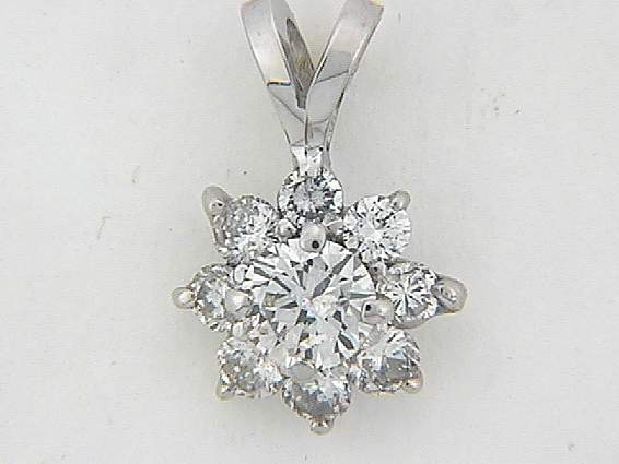 WHITE GOLD PENDANT WITH ROUND BRILLIANT SHAPE DIAMOND SURROUNDED BY 8PC ROUND SHAPE DIAMOND SET IN PRONGS SETTING.