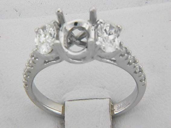 14K WHITE GOLD RING WITH .20CT ROUND SHAPE DIAMOND , SIDE OF (2PC) 1CT OVAL SHAPE DIAMOND SET IN PRONGS SETTING.