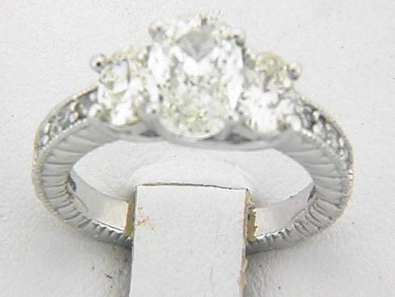 14K WHITE GOLD RING WITH .20CT ROUND SHAPE DIAMOND (2PC) .92CT OVAL SHAPE DIAMOND SET IN PRONGS AND PAVE SETTING. CENTER OF 1.50CT OVAL SHAPE DIAMOND SET IN FOUR PRONGES SETTING. TOTAL OF 2.62CT DIAMONDS.