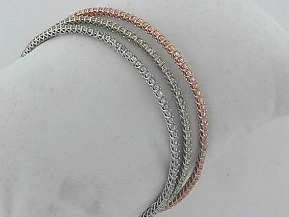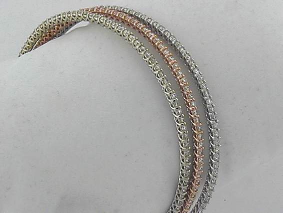 14K WHITE YELLOW AND ROSE GOLD (3PC) BANGLE BRACELET WITH 3CT ROUND SHAPE DIAMOND IN EACH OF THE BANGLE TOTAL OF THREE BANGLE 9CT DIAMOND SET IN PRONGS SETTING.