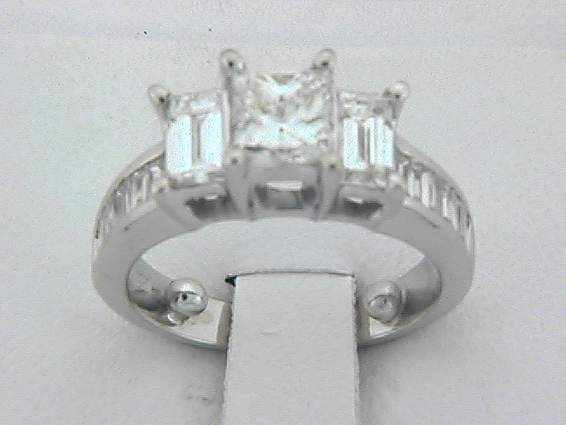 14K WHITE GOLD HAND MADE RING WITH .50CT BAGUETTE DIAMOND SET IN CHANNEL SET, SIDE OF (2PC) TOTAL OF ALMOST 1CT EMERALD CUT DIAMOND, CENTER OF 1CT PRINCESS CUT DIAMOND SET IN PRONGS SETTING. TOTAL OF 2.50CT DIAMOND.