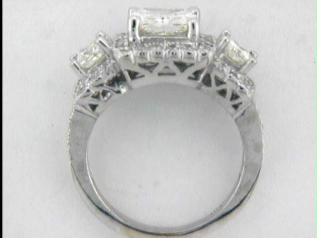 14K WHITE GOLD RING WITH .80CT ROUND SHAPE DIAMOND SET IN PAVE setting SIDE OF (2PC) .75CT PRINCESS CUT DIAMOND, AND CENTER OF 2.58CT PRINCESS CUT DIAMOND SET IN FOUR PRONGS SETTING.