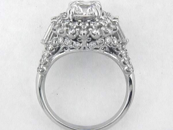 14K WHITE GOLD RING WITH 1.80CT ROUND CUT DIAMOND AND .66CT EMERALD CUT BAGUETTE DIAMOND SET IN PRONGS SETTING. CENTER OF 2.09CT CUSHION CUT DIAMOND SET IN FOUR PRONGS SETTING.