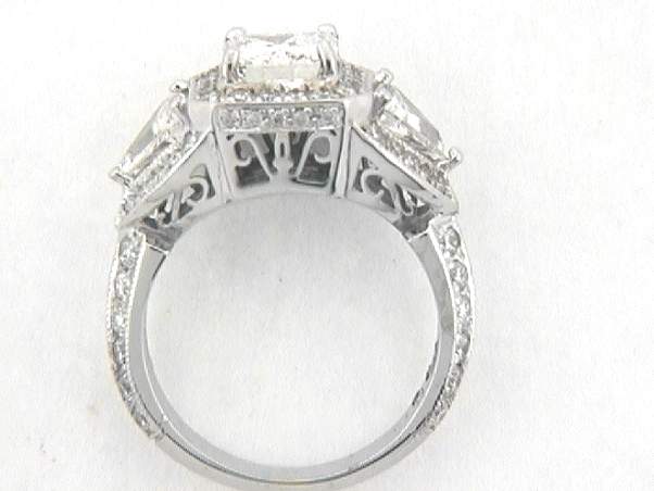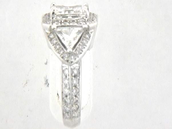 14K HANDMADE WITH CENTER OF 1.53CT RADIANT CUT DESIGN WITH TWO (2) TRIANGLE TOTAL OF .70CT SET IN PRONGS AND WITH ALL PAVE SETTING ROUND DIAMONDS WITH A TOTAL WT. OF .80CT