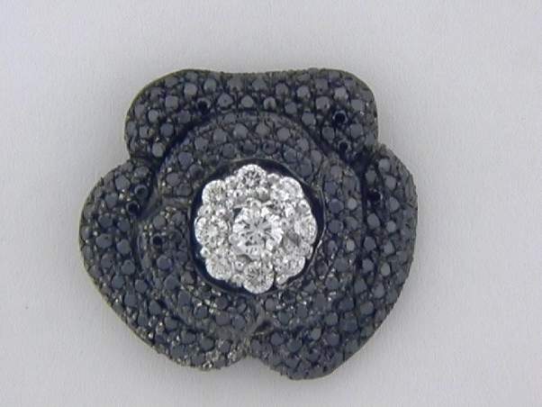 14K WHITE GOLD PENDANT HANDMADE WITH A TOTAL OF 2.59CT BLACK DIAMONDS SET IN PAVE SETTINGS AND WITH A (9PCS.) CENTER OF .52CT ROUND BRILLIANT DIAMONDS SET IN PRONGS SETTINGS.