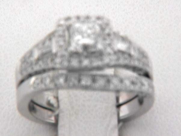 14K WHITE GOLD HAND MADE ENGAGEMENT SET WITH 1CT ROUND AND BAGUETTE DIAMOND SET IN PRONGS SETTING, CENTER OF ALMOST .75CT PRINCESS CUT DIAMOND SET IN FOUR PRONGS SETTING.