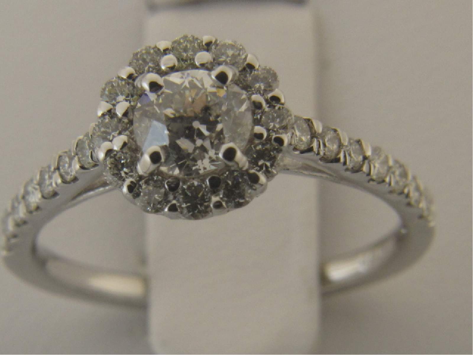 14K WHITE GOLD LADIES RING WITH A CENTER OF .53CT ROUND SHAPE DIAMONDS SET IN PRONGS AND WITH .40CT ROUND SHAPE DIAMONDS SET IN PAVE SETTINGS.