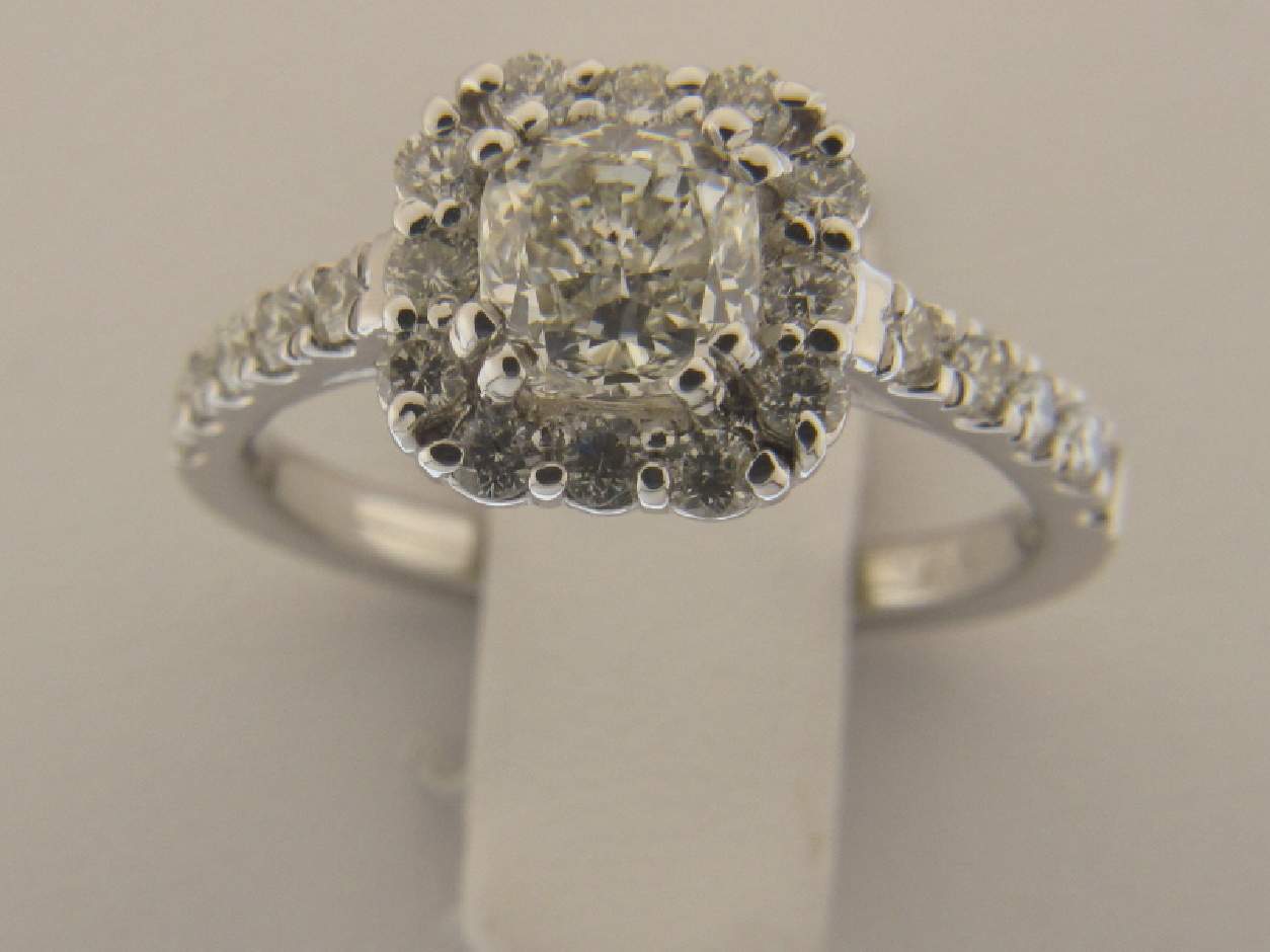 14K WHITE GOLD LADIES RING WITH A CENTER OF 1.20CT PRINCESS-CUT DIAMONDS SET IN PRONGS AND WITH .60CT ROUND SHAPE DIAMONDS SET IN PAVE SETTINGS.