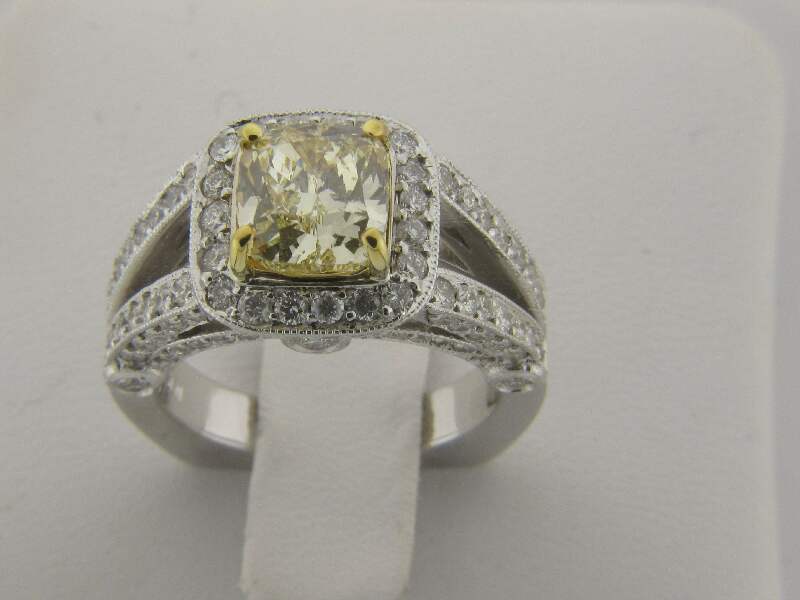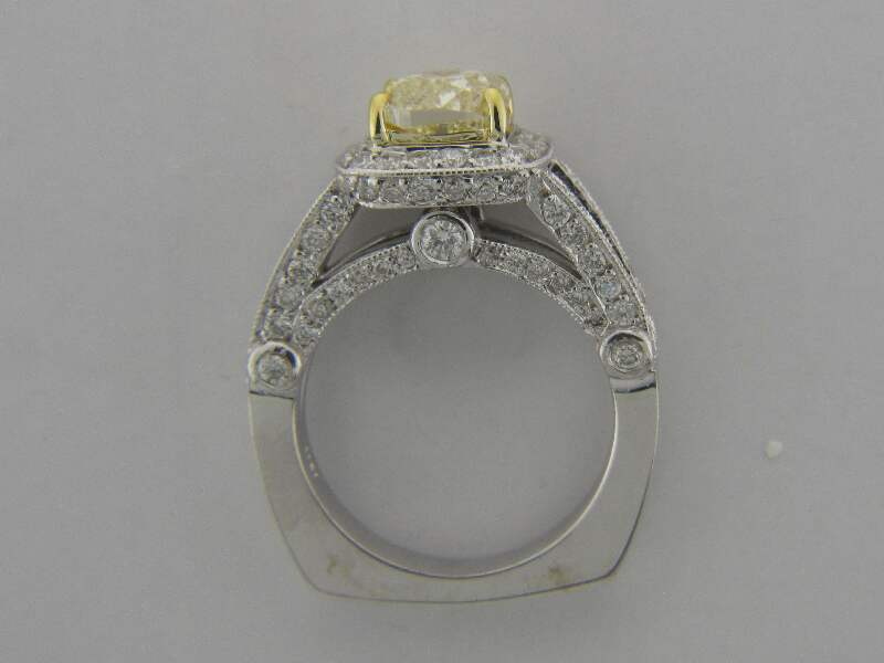 14K WHITE GOLD RING WITH 2CT ROUND SHAPE DIAMOND SET IN PAVE AND BEZEL SETTING,CENTER OF CUSHION CUT FANCY YELLOW DIAMOND SET IN PRONGS SETTING.